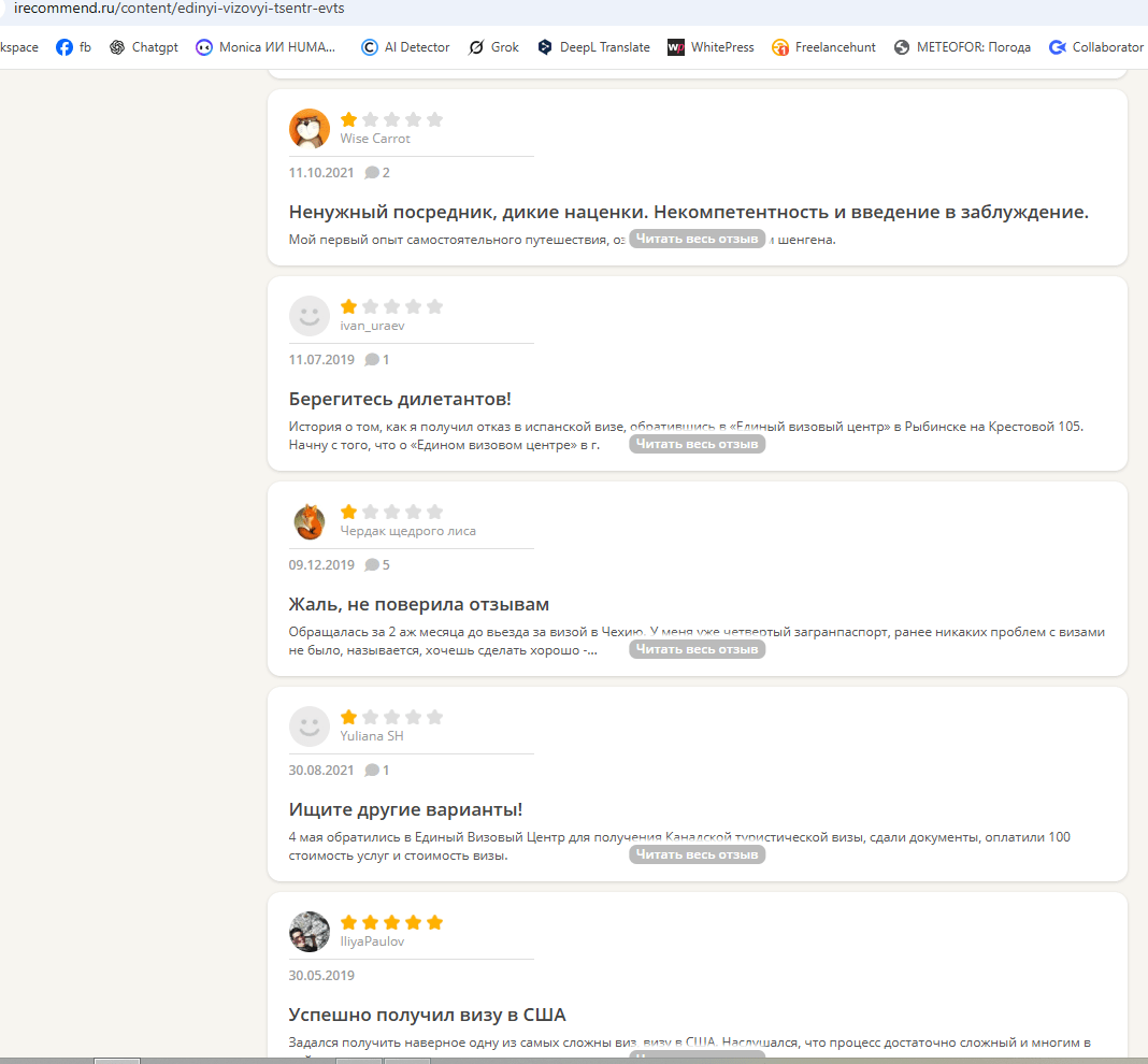 Обратите внимание, что отзывы о сайте Единый Визовый Центр и репутация фирмы в интернете помогают понять, какие вопросы чаще всего обсуждаются клиентами, на примере их персонального опыта взаимодействия с компанией (кто получал визы через ЕВЦ, что пишут клиенты в отзывах) и что стоит выяснять на консультации. В то же время, такие комментарии отражают всего лишь мнения отдельных пользователей о компании и не заменяют самостоятельное изучение договора, его условий и сравнительный анализ фирмы в сети по разным источникам.