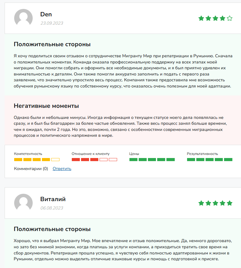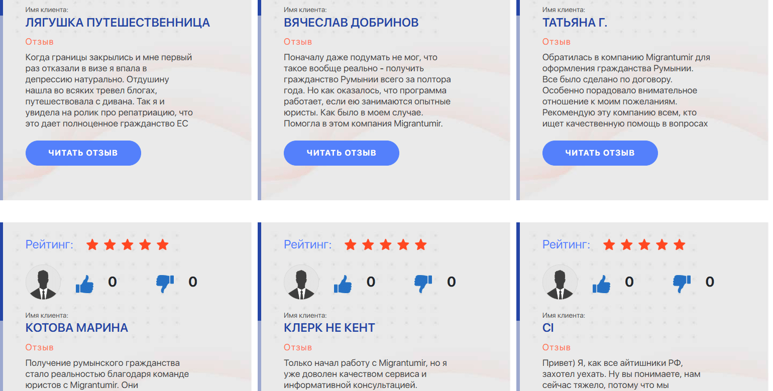 Клиенты Migrantumir в отзывах обсуждают вопросы репатриации и получения гражданства ЕС (Румыния, Болгария, Польша), подбора программ иммиграции, поиска корней в архивах, подготовки досье и ожидания решений от госорганов.